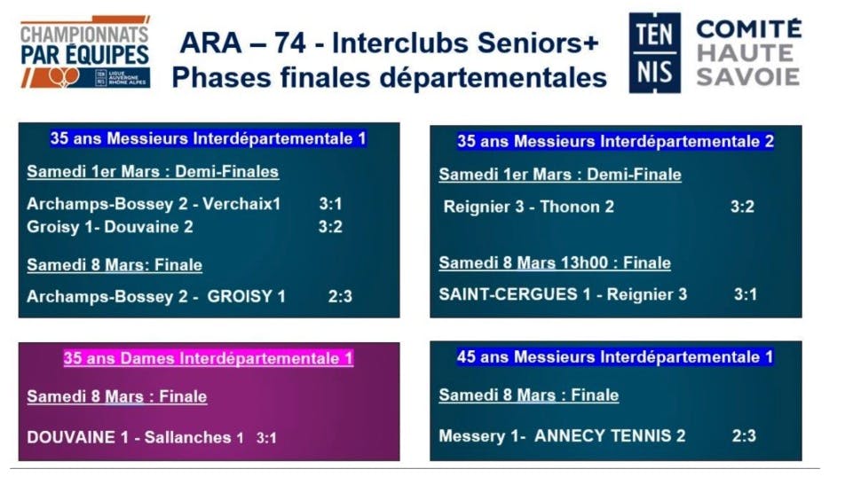 Les 8 clubs vainqueurs et finalistes Archamps, Groisy, Douvaine, Sallanches, Saint-Cergues, Reignier, Messery, Annecy Tennis.
